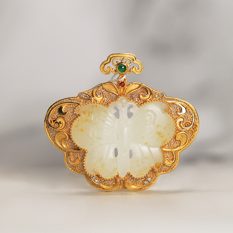 蝴蝶穿梭金丝云绕,玉底透光若隐若现,暗喻“繁华似梦,刹那永恒”